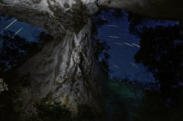 夜の羅生門の真下に入り、広角レンズを真上に向け、手動でストロボを3方向に向けて発光させ岩肌を浮き上がらせる。